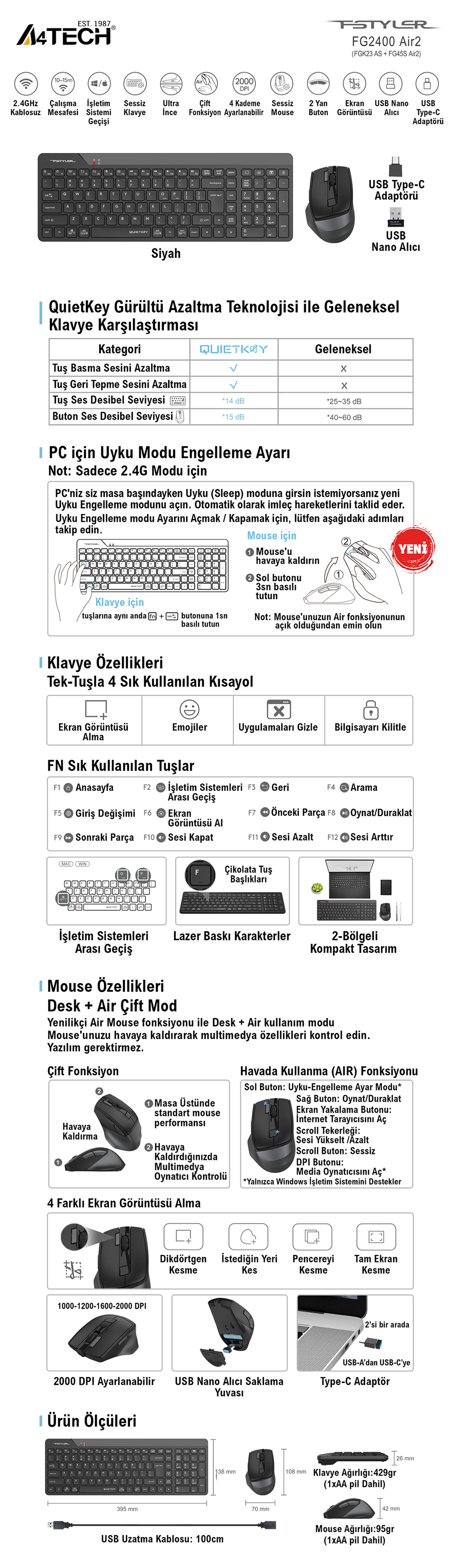 A4 TECH FSTYLER FG2400 AIR 2 KABLOSUZ KLAVYE MOUSE SET
