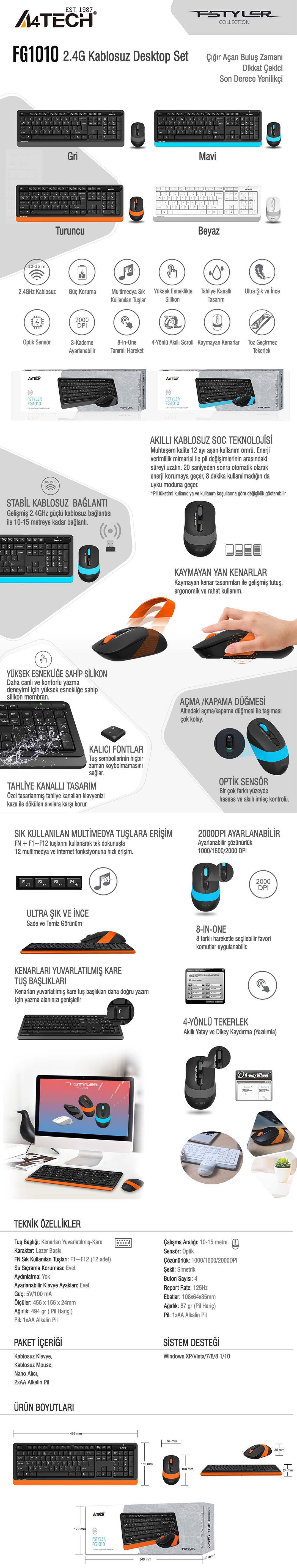 A4 Tech FG1010 Fstyler FN Multimedya Kablosuz Masaüstü Set-Q Türkçe