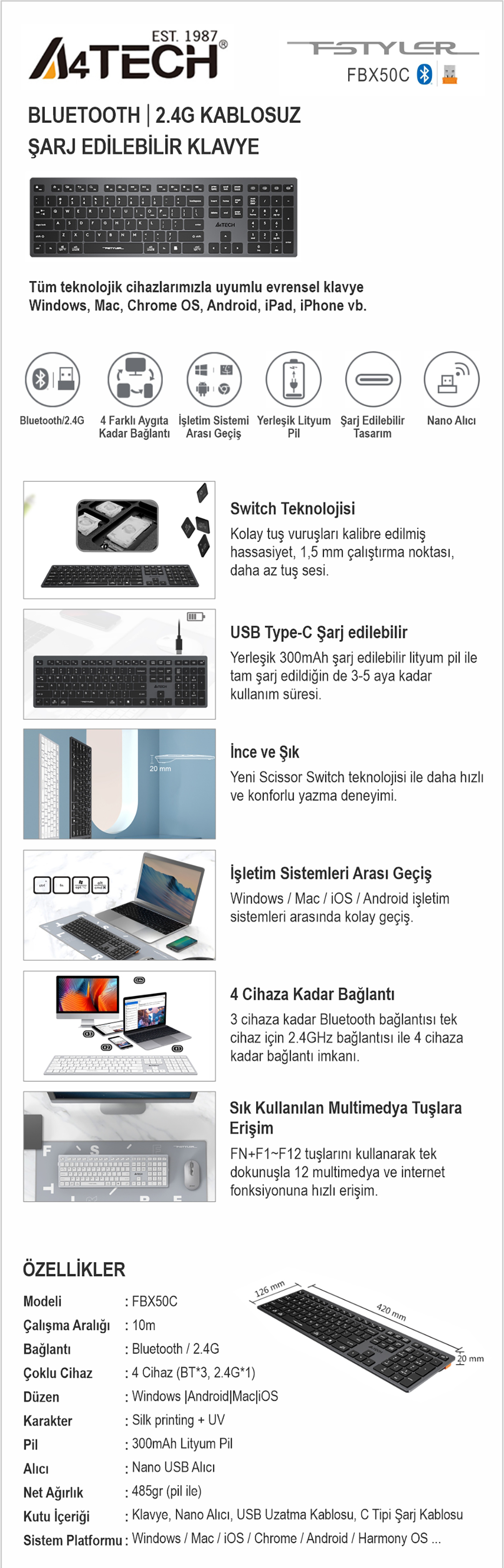 A4 Tech FStyler FBX50C Kablosuz Bluetooth Klavye