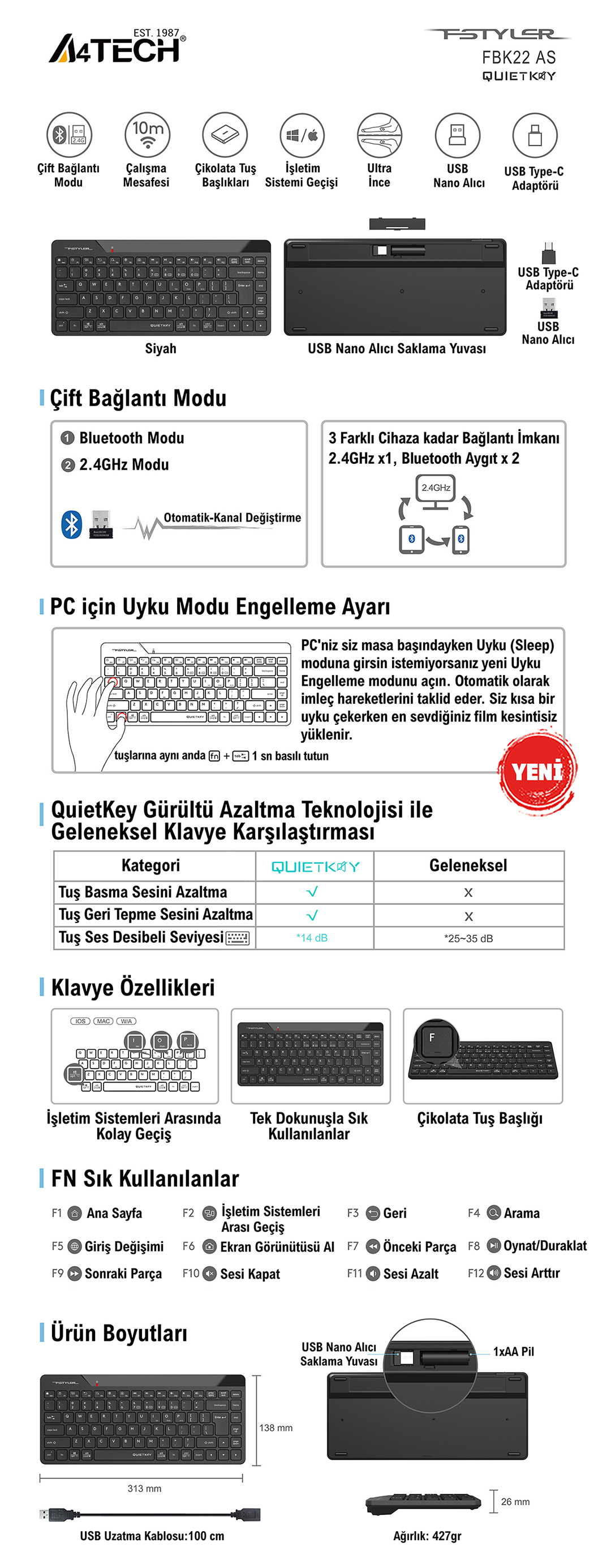 A4 TECH F-STYLER FBK 22AS KABLOSUZ KLAVYE