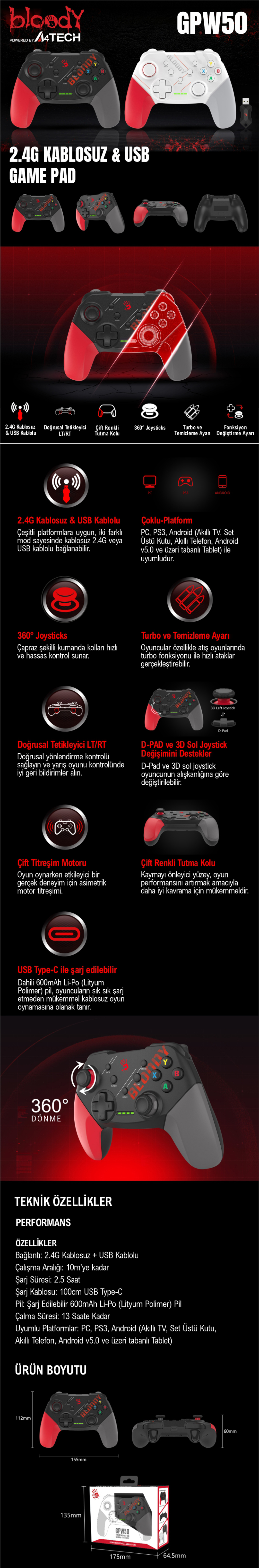 BLOODY GPW50 2.4 KABLOSUZ & USB GAMEPAD